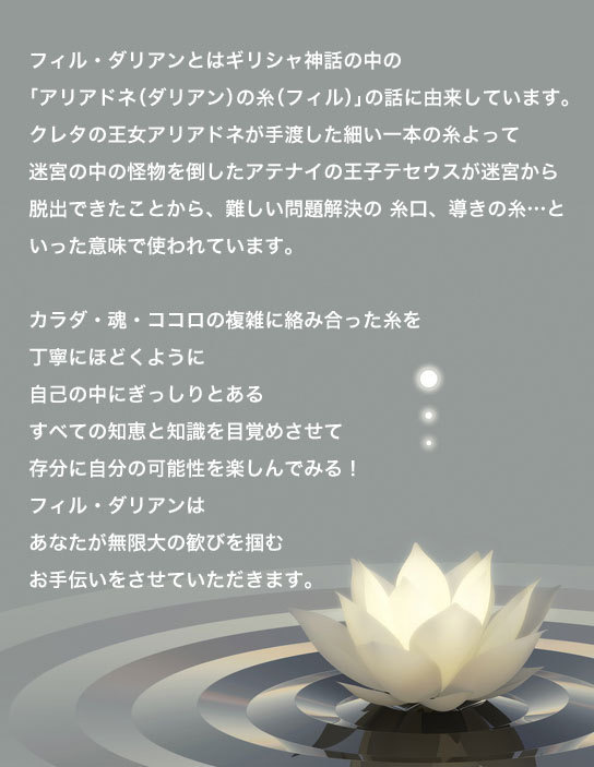FIL d’ ARIANE 2025.04.10 コースサロンケアでは、プロの技術を通して 自分のカラダの可能性を再発見することができます。オイルを使った丁寧なハンドマッサージには、不快な状態を解消するだけでなく、カラダのすみずみまでが喜ぶ効果があります。施術後も気分良く過ごせるように、カラダを... コンセプト手応えを感じて欲しい自分の中にある健やかな美しさ嬉しい時、楽しい時、人はいきいきと輝きます。肌もツヤツヤし、カラダものびのびと動く…これがその人の持つオリジナルな本来の美しさです。ところが、私たちは日常の中で住環境や職場環境などによるさまざ... お問い合わせお問い合わせは、下記にて承っております。*返信をお受け取りいただくために*携帯のメールから送信される場合、受信拒否設定を解除してください。スマートフォン・携帯アドレス、フリーメール等で「返信が来ない」というお声をいただいています。(特にso...